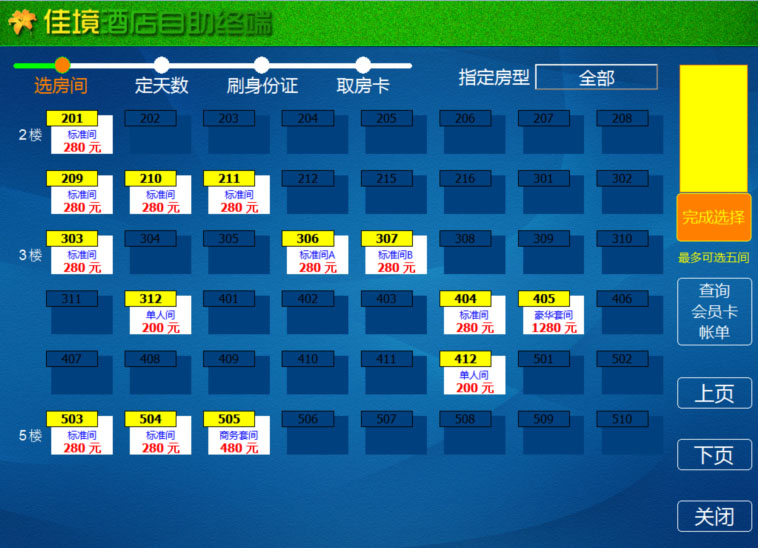 可一次登记最多五个房间
